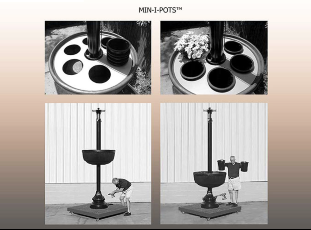 The accessories are for valuable unique additions for special promotions, seasonal changes and holidays. A variety of options for manufacturing systems provides better aesthetics, beauty and safety. Flowers now can go virtually anywhere and everywhere. Landscaping with flowers is now safe from common vandals. Our systems’ design and patents allow for a variety of pole shapes and sizes, such as those that are smooth, fluted, tapered, round, rectangular, oval or custom shapes and sizes. Other varieties of planters can be used other than Bundt. The operation is so easy anyone can do it – teenagers, shop owners, citizens and even mayors for a community ribbon-cutting ceremony.